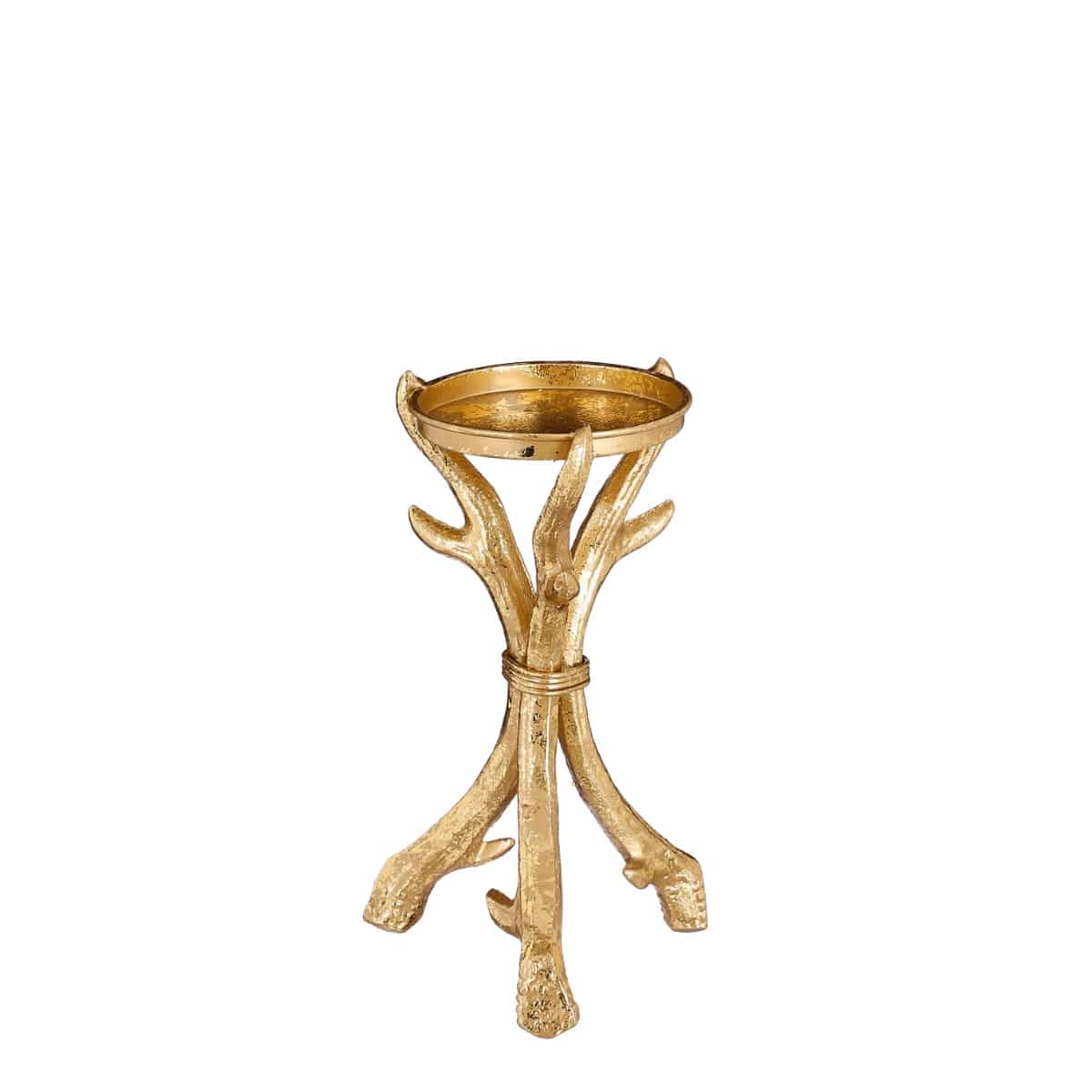 Lysestage i guldfarvet jern med gevirer som ben. Lysestagen er beregnet til bloklys. Lysestagen er som en skulptur med lethed og elegance. Mål:Diameter: 13 cm Højde: 24 cmFremstillet i guldfarvet jern.Pakket med 1 stk.